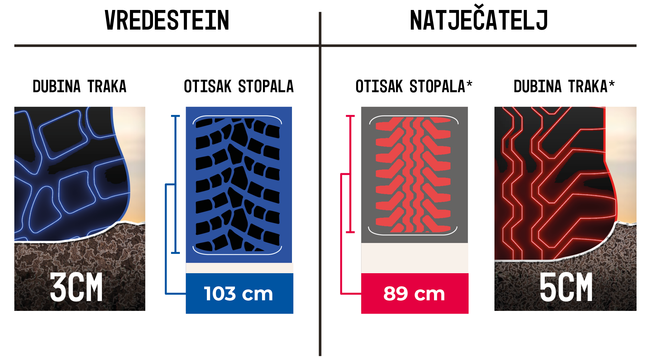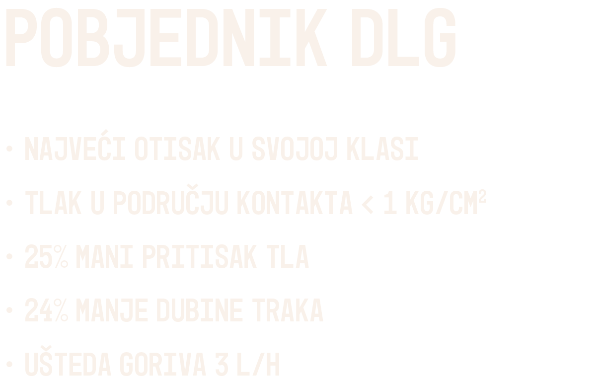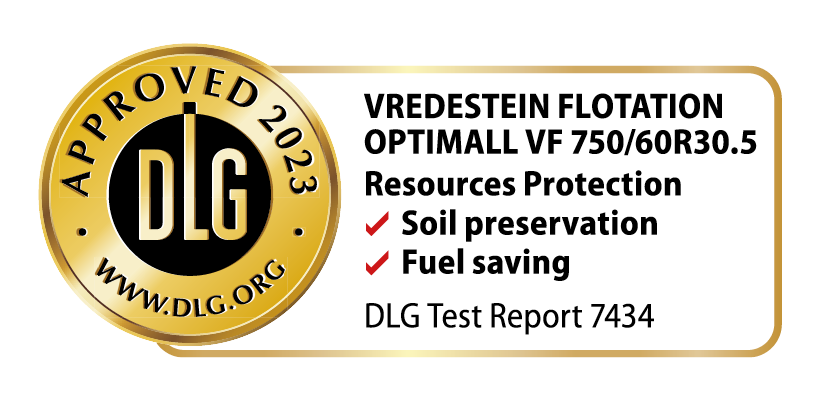 Prema testovima koje je proveo DLG na terenu, u usporedbi s VF konkurentskom gumom. Testirane gume VF 750/60 R 30.5 s opterećenjem od 7.100 kg i tlakom u gumama prilagođenim za maksimalno 10 km/h rada na terenu (1,0 bar).