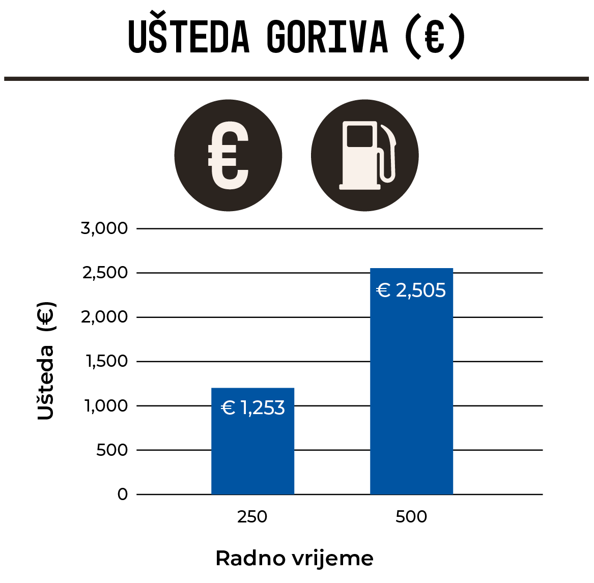 Prema testovima koje je proveo DLG na terenu, ušteda goriva od 3 L/H u usporedbi s VF konkurentskom gumom. Pretpostavka: cijena dizela 1,67 €/litri.